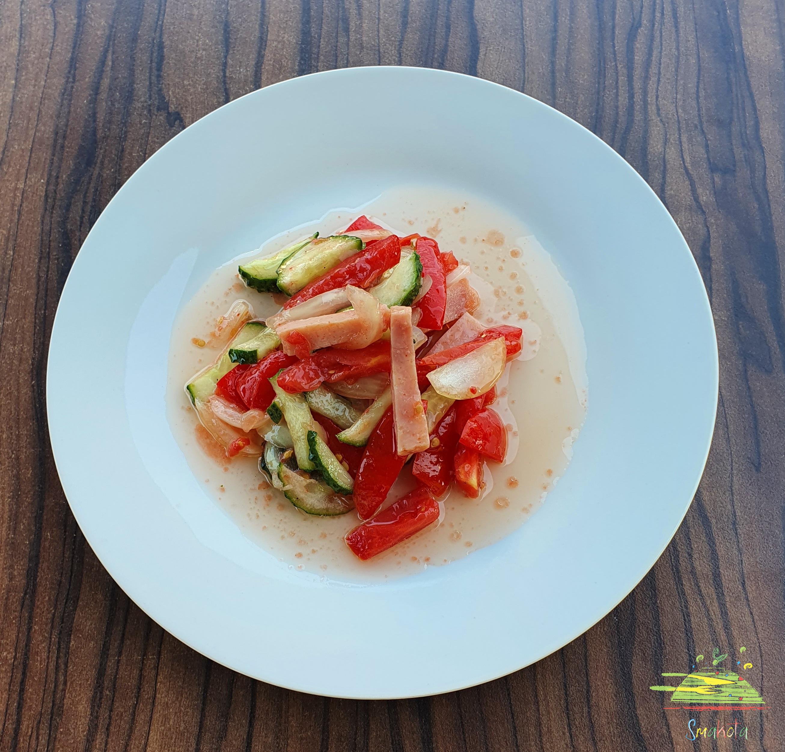 Салат з шинки, томата, огірка та маринованої цибулі