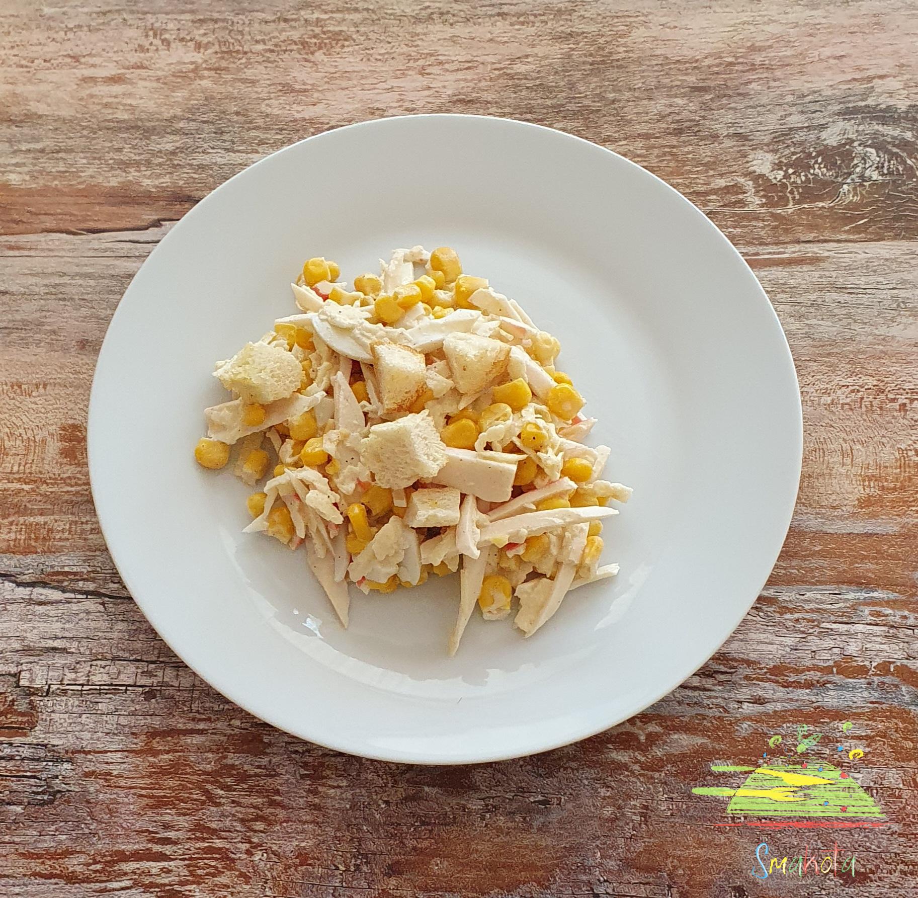 крабові палочки, кукурудза, яблуко, яйце, сухарики, майонез