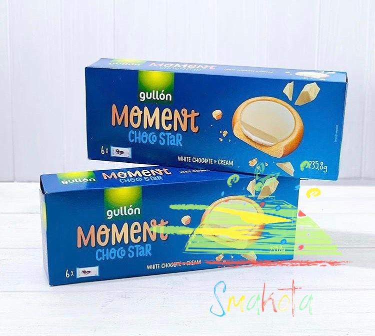 Gullon Moment Choco Star White – испанское печенье, состоящее из шикарного трио – мягкого печенья, нежного сливочного крема ????и бесподобной глазури из молочного шоколада