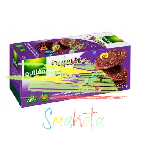 Печенье Gullon Digestive Thins – это шоколадное овсяно-злаковое печенье с голубикой из Испании. В его состав входят злаки (овсяные и цельнозерновые ржаные хлопья, пшеничная мука), подсолнечное масло, сахар, шоколадные чипсы, клюквенный порошок, сушеная голубика в сиропе, порошок какао, растительные волокна, разрыхлитель, соль, натуральная отдушка, эмульгатор (соевый лецитин). Может содержать следы молока. Калорийность продукта составляет 454 ккал/100 г. Из них белков 8,3 г, жиров 18 г, углеводов 60 г.